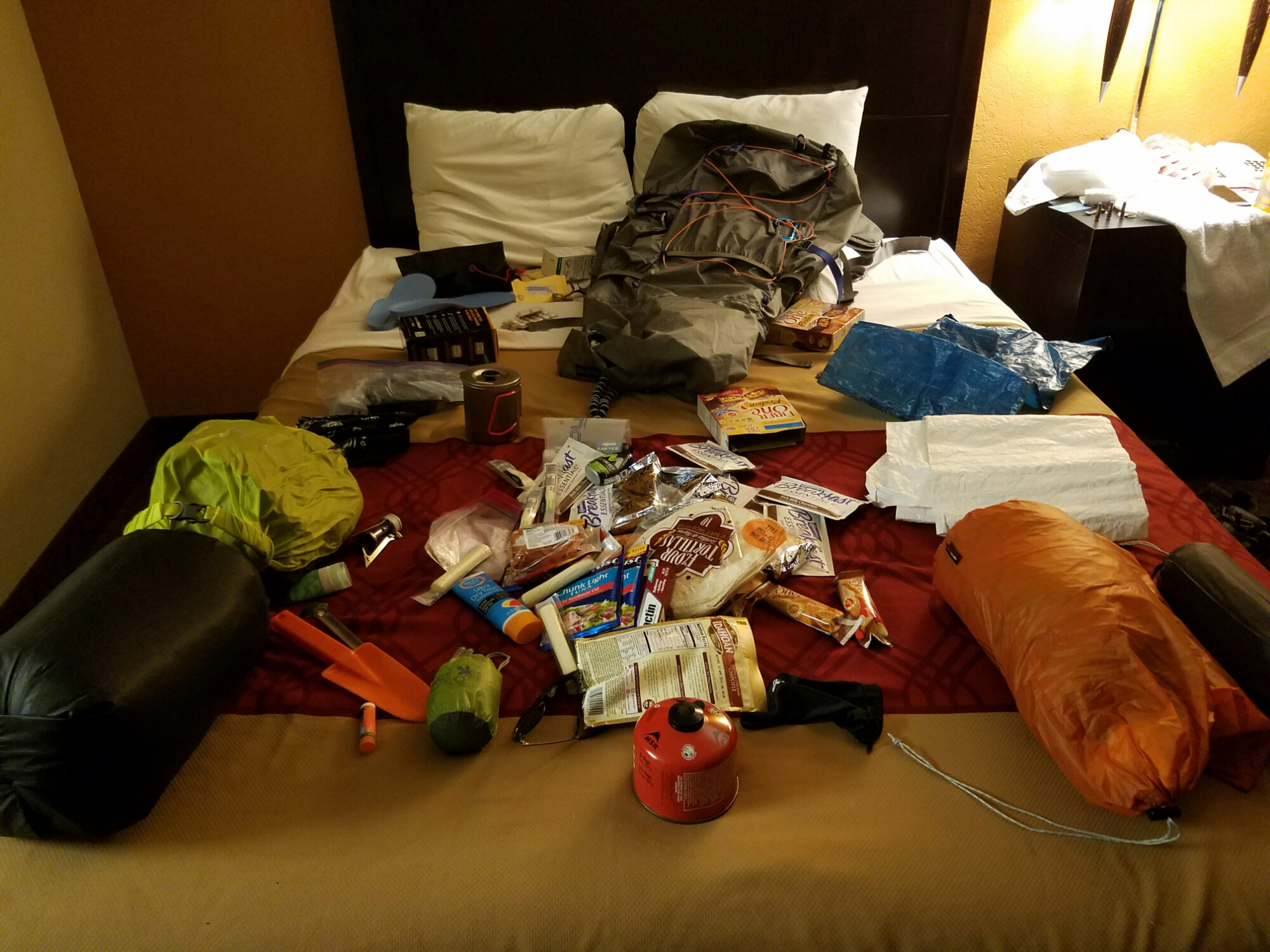 I ran out and purchased food for my first stretch, ran back to my hotel and piled up my gear all over the place. I think I spent about an hour trying to find the perfect way to pack my bag, but ultimately just resigned to throwing things where they fit best. Then I tackled my water…