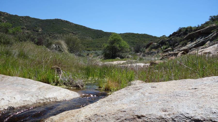 The trail continued upwards, I was mindlessly putting one foot in front of the other while shaking a mental fist at the mountain. Eventually the trail had mercy on us and we dipped down into a valley. I remembered that there was a spur leading to a creek or something around here. I looked over the edge of the trail and saw lush green grass growing around a shiny band of water winding its way around the dry desert floor. I felt elated, but paranoid. “Did I miss the spur? I missed the spur didn’t I? I’m going to have to backtrack, aren’t I?”. I looked at my map, and sure enough I did miss it. The good news is it wasn’t too far behind, so I broke the foundations of thru-hiking and went backwards to get to the creek. I am so glad I did.
