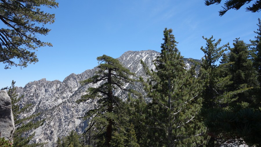Eventually the trail evened out a bit and I was walking along Fuller Ridge. This section of trail gained so much notoriety for being dangerous due to snow, but there wasn’t a single patch. As I continued on the ridge narrowed out a bit more and my views became a bit more clear. I’d been looking for a good spot to take my lunch break, and eventually found it under a tree on a ledge overlooking San Jacinto. I plopped down and ate despite not feeling very hungry and stared off at the mountain I’ve been navigating down all this time. Eventually a hiker strolled by and casually said “Hey what’s up”, I turned around. It’s Tarzan! He’d gotten a late start on the day, I guess I’m not the only one not feeling any urgency about miles today. We looked at the mountain for a moment, took pictures, talked about the plan for the day, then he took off and I was alone with my view again. I pulled my pack under my head and chilled here for about an hour. This trail is the best.