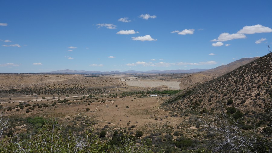 When I woke up I made lunch and got going, back out into the sun. Yep, still hot. The trail followed along a cliff face for a while then spat me out by a.. I dunno what to call it, valley? I dunno, flat land with some hills surrounding it. It was beautiful, I’ll just settle for that. I couldn’t stop to admire it for long however, I needed to find my next source of shade to cool off. The trail continued up to a dirt road with a parking lot, and in that parking lot was an RV. I passed a sign: “CopperTone is here”.