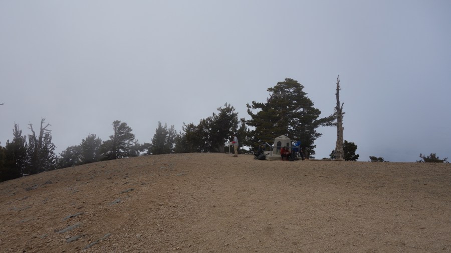 We passed people heading down who assured us that the sun was shining up top and the views were clear. Well there’s that at least! We continued our slow climb up and eventually got to the saddle just before the summit. We were met by a tree standing defiantly against the wind, a sign informing us that it was 1,500 years old. I stood in awe before it. I suppose it’s no older than the mountain it sits on, but a lot of the trees around here weren’t so lucky and were either toppled over by the wind or were hit by lightning. Yet here’s this one tree clutched to either side of the saddle refusing to topple.