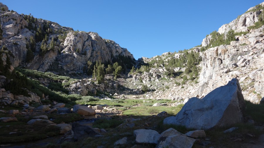 I woke up the next morning not feeling rested at all. The whole bear escapade kept me alert well passed my bed time. I slowly packed up my camp and got going. The trail stayed in the trees most of the morning and I felt it would stay that way for most of the day. My first obstacle of the morning was Evolution Creek, the more notorious river ford on the entire trail due to its extremely high water level in years with higher snow levels in the Sierra. This year was a normal snow year, which meant it’d at least be pretty high. But when I got there I only found it to go just above my knees in areas, the main hazards here were the fleet of mosquitoes and the freezing cold water, nothing more. I pressed on feeling a little let down that it was done and over with that quick, I envisioned it being a bit more of an obstacle. The trail went down for an incredibly long time and I felt bad for all the JMT hikers I passed who had to hike up this thing. Muir Pass is probably the hardest part of the trail for JMT hikers from what I’ve seen so far.