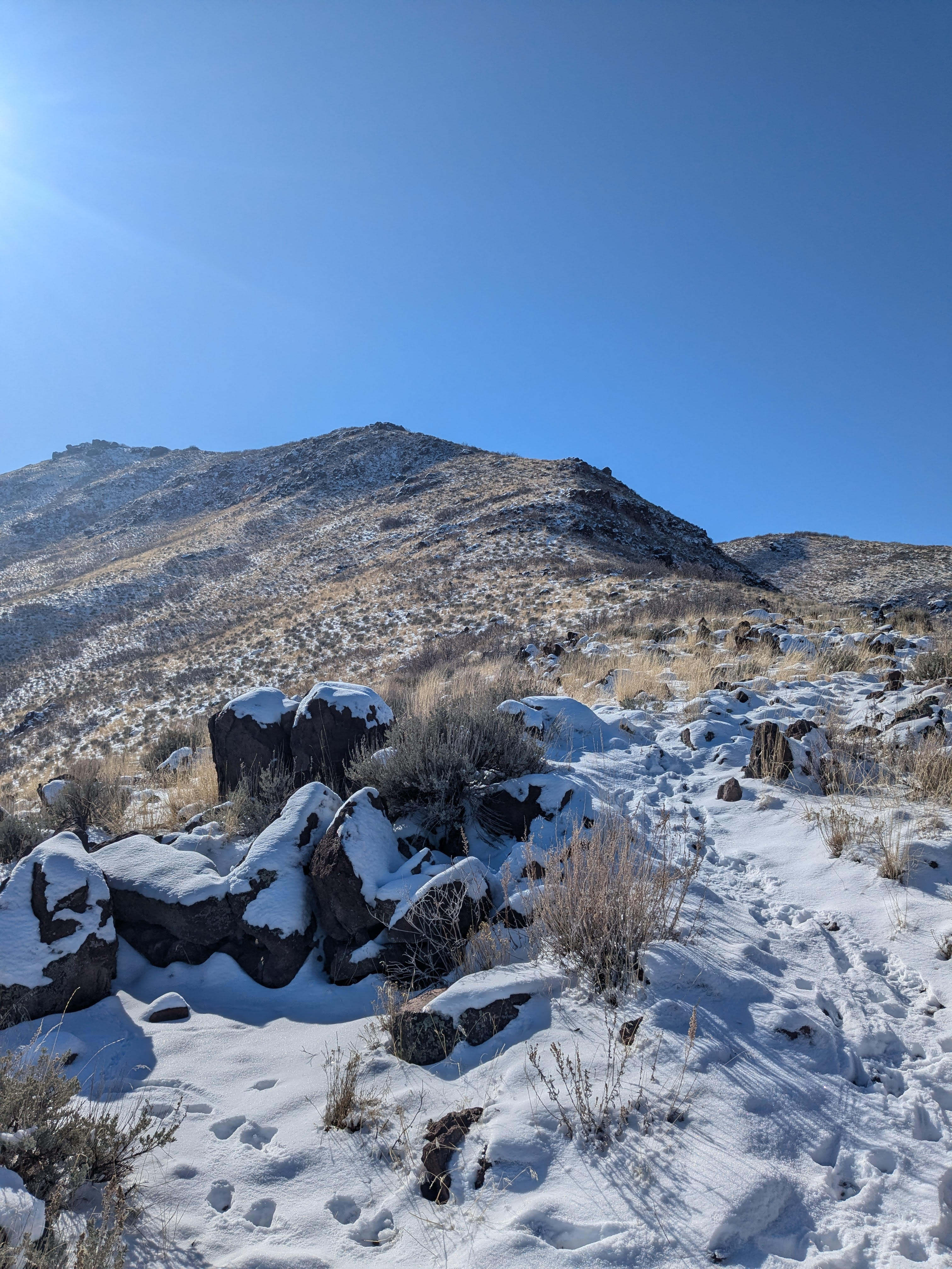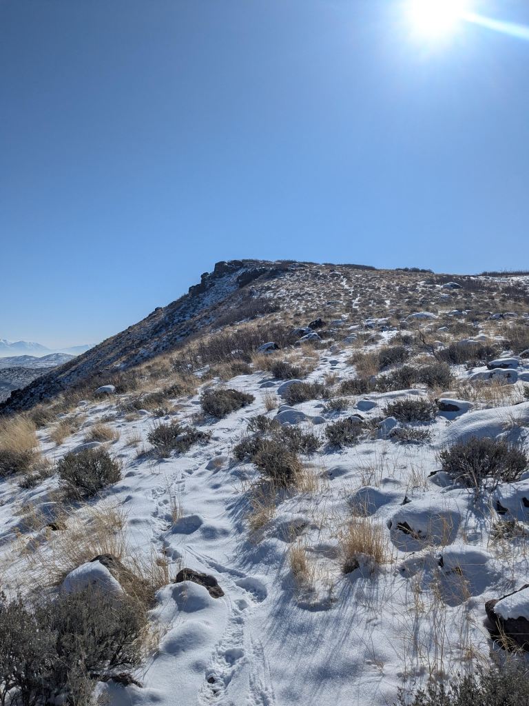 I got to the junction that heads up the long extending spine and found the snow was slick and dusty, providing basically no traction. I had a totally different route in mind until I last minute decided I’d head up the mountain so didn’t have my spikes with me. I took it slow and slid my way up acutely aware of the fact that going back down was going to be a funny sight to say the least.
